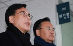 김건희특검이 '로저비비에 클러치백 수수 의혹'과 관련해 국민의힘 김기현 의원실과 자택 등에 대해 압수수색에 착수한 17일 국회의원회관 내 김 의원 사무실 방문을 마친 송언석 원내대표가 입장을 밝히고 있다. 오른쪽은 유상범 원내수석부대표. 연합뉴스 국민의힘이 17일…