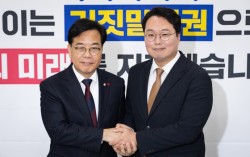 국민의힘 송언석, 개혁신당 천하람 원내대표가 17일 서울 여의도 국회에서 만나 손을 맞잡고 있다. 뉴스1 정치권을 덮친 ‘통일교 특검’을 고리로 국민의힘과 개혁신당이 손을 맞잡았다. 내년 6·3 지방선거를 5개월여 앞둔 시점에 양당 원내대표의 첫 회동이 성사됐다는…