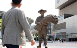 대구 동구 동대구역 광장을 지나던 시민이 박정희 전 대통령 동상을 바라보고 있다. 뉴스1 동대구역 광장에 설치된 박정희 전 대통령 동상에 계란을 던진 남성이 경찰에 자수했다. 23일 대구 동부경찰서 등에 따르면 20대 남성 A씨는 전날 오후 서울 한…