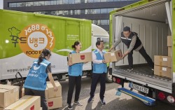 18일 서울 동작구 SPC미래창조원에서 진행된 푸드뱅크 식품 배송차량 전달식에서 도세호 SPC 대표이사(오른쪽 둘째)와 임직원들이 기부 차량에 빵을 싣고 있다. 사진 SPC그룹 SPC그룹이 한국사회복지협의회 전국푸드뱅크(푸드뱅크)에 식품 배송용 냉동 탑차…