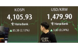 22일 서울 중구 하나은행 딜링룸 전광판 증시 종가가 나타나고 있다. 뉴스1 한국경제인협회(한경협·FKI)는 국내 주식을 기프티콘으로 만들어 선물할 수 있게 하자는 아이디어를 국무조정실에 건의했다고 23일 밝혔다. '주식 기프티콘'은 삼성전자, SK하이닉스 …