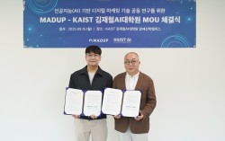 (왼쪽부터) 이주민 매드업 대표, 정송 KAIST 김재철AI대학원 대학원장 AI 마케팅 컴퍼니 매드업(대표 이주민, 이동호)이 지난 15일 AI 연구 기관인 KAIST 김재철AI대학원(약칭 ‘KAIST AI’, 대학원장 정송)과 인공지능(AI) 기반 디지…