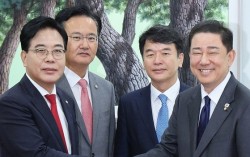 김병기 더불어민주당 원내대표와 송언석 국민의힘 원내대표가 지난달 10일 오후 서울 여의도 국회에서 원내대표 회동을 하고 있다. 왼쪽부터 송 원내대표, 유상범 원내수석, 문진석 원내수석, 김 원내대표. 뉴스1 더불어민주당과 국민의힘은 10일 ‘필리버스터 중지법’(국…