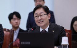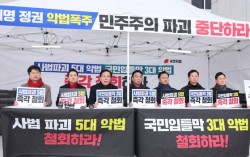 송언석 국민의힘 원내대표가 10일 서울 여의도 국회 본관 앞에 마련된 8대 악법 저지 릴레이 천막 농성장에서 발언하고 있다. 뉴스1 국민의힘이 10일 더불어민주당의 쟁점 법안 추진을 저지하기 위한 천막 농성에 돌입했다. 장동혁 대표, 송언석 원내대표, 정희용…