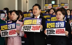 국민의힘 장동혁 대표와 서명옥 당중앙여성위원장 등 참석자들이 10일 오전 서울 여의도 켄싱턴호텔에서 열린 중앙여성위원회 발대식에서 및 1차 전체회의에서 더불어민주당을 규탄하고 있다. 뉴스1 장동혁 국민의힘 대표가 10일 윤영호 전 통일교 세계본부장이 “더불어민주당…
