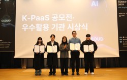 [NIA는 12월 18일(수), 오픈 클라우드 플랫폼 PUB을 개최하고 K-PaaS 공모전 시상식을 진행했다. 왼쪽부터 아이디어 기획 부문 한국지능정보사회진흥원장상 ‘맘쏙’ 팀, 과학기술정보통신부장관상 ‘꾸꾸네 인력’팀, 한국지능정보사회진흥원 김은주 본부장(가운데), …