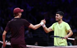 슈퍼매치에서 라이벌 신네르(왼쪽)를 꺾고 활짝 웃는 알카라스. 뉴스1 한국에서 열린 남자프로테니스(ATP) 세계 1, 2위 맞대결에는 화려한 플레이, 재치 넘치는 팬 서비스 그리고 관중의 뜨거운 환호 등 볼거리가 넘쳐났다. 카를로스 알카라스(1위·스…