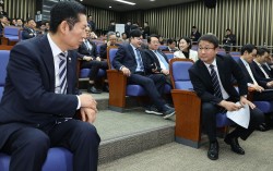 28일 오후 서울 여의도 국회 본회의에서 '대법관 증원'을 핵심으로 하는 법원조직법 일부개정법률안에 대한 무제한토론(필리버스터) 종결 투표가 시작되자 국민의힘 의원들이 단상을 점거하고 침묵시위를 하고 있다. 뉴시스 28일 여당은 대법관 증원법 처리에 이어 '재외투…