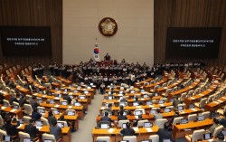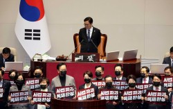 28일 오후 서울 여의도 국회 본회의에서 '대법관 증원'을 핵심으로 하는 법원조직법 일부개정법률안에 대한 무제한토론(필리버스터) 종결 투표가 시작되자 국민의힘 의원들이 단상을 점거하고 침묵시위를 하고 있다.뉴시스 현행 14명인 대법관 수를 26명으로 늘리는 내용의…