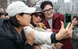 한동훈 전 국민의힘 대표(오른쪽)가 26일 오후 대구 북구 삼성창조캠퍼스를 찾아 지역 주민과 기념촬영을 하고 있다. 뉴스1 불출마냐, 재보궐선거 출마냐. 국민의힘에서 제명된 한동훈 전 국민의힘 대표가 차기 행보 관련 질문에 한 달째 답을 피하고 있다. 한 전 대표…