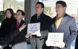 국민의힘 법률자문위원장인 곽규택 의원(왼쪽 세번째)과 최기식 사법정의수호 및 독재저지 특별위원회 위원 등이 8일 오전 경기도 과천시 정부과천청사 고위공직자범죄수사처 민원실 앞에서 이재명 대통령, 정성호 법무부 장관을 직권남용권리행사방해죄 혐의와 문진석 더불어민주당 의원…