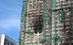 28일(현지시간) 대형 화재가 발생했던 홍콩 북부 타이포의 고층 아파트 단지 웡 푹 코트의 건물 외벽 일부가 까맣게 변해버린 모습. 연합뉴스 홍콩 고층 아파트 단지에서 발생한 대형 화재의 사망자가 151명으로 늘었다. 당국은 보수 공사 과정에서 사용된 비…