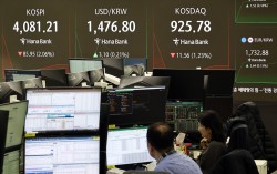 15일 서울 중구 하나은행 딜링룸 현황판에 코스피 지수 등이 표시되고 있다. 연합뉴스 15일 달러당 원화값이 하락세를 이어가며 1480원을 위협하고 있다. 이날 오전 서울 외환시장에서 달러당 원화값은 전 거래일 주간 거래 종가(오후 3시 30분)보다…