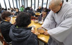 19일 부산 원오사에서 주지스님과 신도들이 ‘새해맞이 무료 급식 봉사’를 했다. 이날 250여명의 어르신에게 점심과 함께 떡과 과일, 달력을 전달했다.