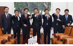 여야가 2일 국회에서 내년 예산안 처리 합의 뒤 기념촬영을 하며 참석자들을 부르고 있다. 왼쪽부터 국민의힘 유상범 원내운영수석부대표, 한병도 국회 예산결산특별위원장, 송언석 국민의힘·김병기 더불어민주당 원내대표, 구윤철 부총리 겸 기획재정부 장관. 관련기사여야, 728…