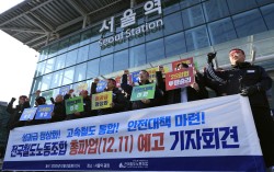 철도노조가 2일 오전 서울역 광장에서 고속철도 통합 등을 요구하며 총파업 예고 기자회견을 갖고 있다. 뉴스1 정부가 2027년까지 고속철도인 KTX와 SRT를 통합하겠다는 방침을 최근 확정했다. 대선 공약을 이행하는 차원이라고 한다. 물론 그 배경에 철…