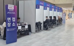 지난 10일 오후 3시 서울대학교 관악캠퍼스 301동(제1공학관) 1층 로비에서 미국 마이크론 대만법인이 현장면접을 진행하고 있는 모습이다. 이우림 기자 #지난 10일 오후 3시 서울대학교 관악캠퍼스 301동(제1공학관) 1층. 학과 점퍼(과잠)를 입은 …