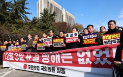 장동혁 대표와 송언석 원내대표를 비롯한 국민의힘 의원들이 2일 오후 서초구 서울중앙지방법원 앞에서 열린 추경호 의원 구속심사 규탄대회에서 구호를 외치고 있다. 뉴스1 국민의힘이 추경호 국민의힘 전 원내대표의 구속 전 피의자 심문(영장실질심사)이 열리는 2일 여론전…
