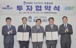 11일 충북 청주시 충청북도청에서 진행된 ‘안전 스마트 공장 조성을 위한 투자 협약식’에서 주요 참석자들이 기념촬영을 하고 있다. 왼쪽부터 임호선 더불어민주당 의원, 조병옥 음성군수, 도세호 SPC그룹 사장, 김영환 충청북도지사, 허진수 SPC그룹 부회장. 사진 SPC…