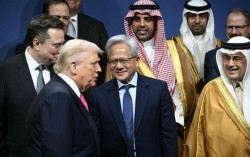 도널드 트럼프 미 대통령이 19일(현지시간) 미 워싱턴DC의 케네디 공연예술센터에서 열린 ‘미·사우디 투자 포럼’에서 일론 머스크 테슬라 최고경영자(왼쪽), 젠슨 황 엔비디아 창업자 겸 최고경영자(가운데) 앞을 지나 기념 촬영을 위해 이동하고 있다. [AFP=연합뉴스]…