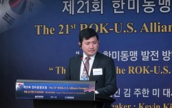 케빈 김 주한미국대사대리가 28일 서울 용산구 드래곤힐호텔에서 한미동맹재단 주최로 열린 한미동맹포럼에 초청연사로 참석하고 있다. 연합뉴스 케빈 김 주한 미국 대사대리가 28일 한·미 동맹은 “한반도 뿐만 아니라 인도·태평양 지역에서 공동의 도전 과제를 해…