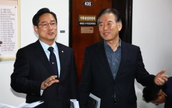 정태호 국회 기획재정위원회 더불어민주당 간사(오른쪽)와 박수영 국민의힘 간사가 28일 서울 여의도 국회에서 조세소위 회의를 마치고 세제개편안 합의 관련 기자회견을 하고 있다. 뉴시스 여야가 28일 배당소득 분리과세에 50억원 초과 구간을 신설하고 최고 세율을 30…