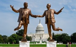 지난 9월 23일(현지시간) 워싱턴 국회의사당 근처 내셔널 몰에 도널드 트럼프 미국 대통령과 제프리 엡스타인을 형상화한 조각상이 세워져 있다. AP=연합뉴스 도널드 트럼프 미국 대통령이 ‘제프리 엡스타인’ 논란 확산 방지에 총력을 기울이고 있다. ‘엡스타…