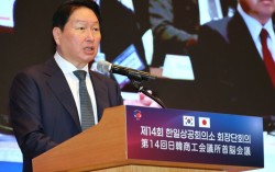 최태원 대한상공회의소 회장이 8일 제주 신라호텔에서 열린 '제14회 한일 상의 회장단 회의'에서 개회사를 하고 있다. 사진 대한상의 ‘한일 국교 정상화 60주년’을 맞아 최태원 대한상공회의소(대한상의) 회장이 한일 양국의 ‘여권없는 왕래’를 시작하고 보다…