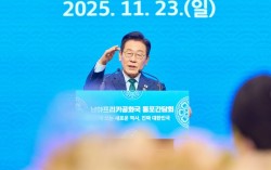이재명 대통령이 23일(현지시간) 남아프리카공화국 샌튼의 한 컨벤션센터에서 열린 동포오찬간담회에 참석해 발언하고 있다. 대통령실사진기자단 지난 9월 미국 조지아주 배터리 공장 건설 현장에서 현지 이민 당국에 체포·구금됐던 한국인 근로자 300여명에게 이재…