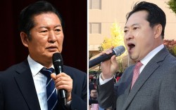 정청래 더불어민주당 대표(왼쪽 사진)가 지난 22일 전남 나주 한국에너지공대에서 특별강연을 하고 있다. 오른쪽은 장동혁 국민의힘 대표가 23일 경남 창원시 중앙동에서 열린 ‘민생회복 법치수호 국민대회’에 참석해 발언하는 모습. [뉴시스]