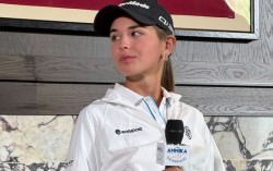 도널드 트럼프 미국 대통령의 손녀인 카이 트럼프가 12일 진행된 LPGA 투어 안니카 드리븐 공식 기자회견에서 취재진을 쳐다보고 있다. AP=연합뉴스 미국여자프로골프(LPGA) 투어 대회 데뷔를 앞둔 도널드 트럼프 미국 대통령의 손녀인 카이 트럼프가 할아…