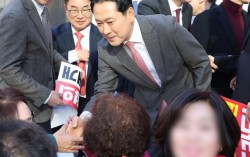 장동혁 국민의힘 대표가 23일 오후 경남 창원 성산구 한서빌딩 앞 광장에서 열린 '민생회복 법치수호 국민대회'에 참석해 발언 한 뒤 지지자들과 악수하고 있다. 송봉근 객원기자 국민의힘이 부산·울산·경남(PK)에서 이른바 ‘장외 민심투어’의 출발을 끊었다…