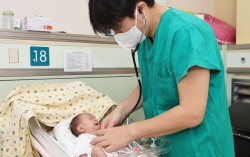 정의석 서울아산병원 신생아과 교수가 지난 2일 수술 후 신생아 중환자실에서 집중치료를 받고 있는 홍이준군을 진찰하고 있다. 사진 서울아산병원 "아이를 임신했을 때 심장이 좋지 않다는 진단을 듣고 많이 걱정했지만, '아이는 우리가 잘 치료할 테니 출산에만…