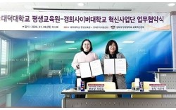 ▲ 2026년 1월 8일 대덕대학교 정곡관에서 열린 협약식에서 서진숙 경희사이버대학교 교육혁신본부장(왼쪽)과 이무영 대덕대학교 평생교육원 원장이 협약서에 서명한 뒤 기념 촬영을 하고 있다. 경희사이버대학교는 1월 8일, 대전에 위치한 대덕대학교 평생교육원…
