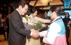 이재명 대통령과 김혜경 여사가 20일(현지시간) 이집트 카이로의 한 호텔에서 열린 이집트 동포 지상사 간담회에서 화동으로부터 꽃다발을 받고 있다. 전민규 기자 이집트를 공식 방문 중인 이재명 대통령은 20일(현지시간) 카이로의 한 호텔에서 동포간담회를 열…