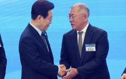 이재명 대통령이 27일 전북 군산새만금컨벤션센터에서 열린 새만금 로봇·수소·AI 시티 투자협약식에서 기념촬영을 마친 뒤 정의선 현대차그룹 회장과 악수하고 있다. 연합뉴스 현대차그룹이 전북특별자치도 새만금에 9조원을 투입해 로봇과 인공지능(AI), 수소 에너지 생태…
