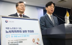 김영훈 고용노동부 장관과 박수근 중앙노동위원장이 27일 서울 종로구 정부서울청사에서 노조법 2·3조 현장 안착을 위한 공동 브리핑을 하고 있다. 연합뉴스 정부가 ‘노란봉투법’(노동조합 및 노동관계 조정법 2·3조 개정안) 시행을 약 열흘 앞두고 원·하청 교섭을 분…