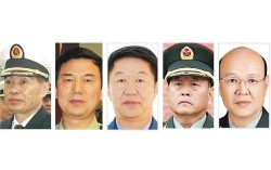 26일 중국 전국인민대표대회 상무위원회 회의에서 대표 자격이 박탈된 중국군 상장(대장)들. 왼쪽부터 선진룽(沈金龍) 전 해군사령관, 친성샹(秦生祥) 전 해군정치위원, 위중푸(于忠福) 전 공군정치위원, 리차오밍(李橋銘) 전 육군사령관, 리웨이(李偉) 정보지원부대 정치위원…