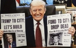 도널드 트럼프 미국 대통령이 양손에 신문 1면을 인쇄한 종이 두 장을 각각 들고 앉아 활짝 웃고 있다. 트럼프 대통령이 왼손에 든 것(사진 오른쪽)은 1975년 실제 ‘뉴욕 데일리 뉴스’의 1면으로, “포드, 뉴욕에 : 꺼져라”라는 제목이 적혀 있다. 오른손에 든 신문…