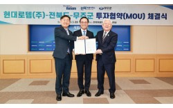 3일 전북 전주시 효자동 전북특별자치도청 회의실에서 열린 현대로템㈜-전북도-무주군 투자협약식에서 김관영 전북지사(왼쪽)와 현대로템㈜ 이용배 대표이사(가운데), 황인홍 무주군수가 기념사진을 찍고 있다. 이번 협약은 현대로템㈜이 무주 적상면 방이지구 일원 76만330㎡에 …