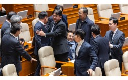 더불어민주당 박선원 의원(가운데 자리에 앉은 사람)이 26일 국회에서 열린 본회의 도중 국민의힘 의원들과 비속어 사용을 놓고 설전을 벌이자 동료 의원들이 이를 말리고 있다. [연합뉴스] 천영식 방송미디어통신위원회 상임위원 후보자 추천안이 26일 국회 본회…