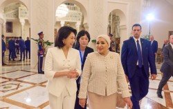 이재명 대통령의 부인 김혜경 여사와 압델 파타 알시시 이집트 대통령의 부인 인테사르 알시시 여사가 20일(현지시간) 이집트 카이로 대통령궁에서 환담장으로 이동하고 있다. 전민규 기자 이집트를 공식 방문 중인 이재명 대통령의 부인 김혜경 여사는 20일(현지…
