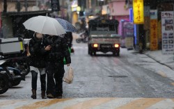 12일 서울 성북구 성신여대역 인근에서 시민들이 우산을 쓴채 이동하고 있다. 연합뉴스 기온이 급격히 오르면서 15일 오전에 수도권을 중심으로 눈 대신 비가 내릴 전망이다. 도로 곳곳엔 비가 얼어붙으면서 ‘블랙아이스(도로살얼음)’가 발생할 가능성이 커 출근…