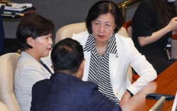 추미애 국회 법제사법위원장이 22일 오전 서울 여의도 국회 본회의장에서 박지원 더불어민주당 의원과 대화하고 있다. 뉴스1 더불어민주당이 추미애 국회 법제사법위원장 선출 이후 처음 열리는 법사위 전체회의에 김건희 특검팀의 수사 인력을 강화하는 내용을 담은 특검법 개…