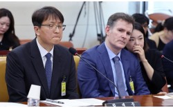 박대준 쿠팡 대표(왼쪽)가 2일 국회 과학기술정보방송통신위원회전체회의에서 열린 쿠팡 개인정보 유출 사태와 관련 현안질의에서 의원 질의에 굳은 표정을 짓고 있다. 오른쪽 둘째는 브랫 매티스 쿠팡 CISO. 임현동 기자 “국민들이 김범석 의장 사과를 원하는데…