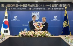 유홍림 서울대 총장(왼쪽)과 홍범준 좋은신사고 대표(오른쪽)가 13일 서울대에서 협약을 체결한 뒤 기념 촬영을 하고 있다. 사진 서울대 초중고 수학 참고서 ‘쎈’ 등을 만드는 ‘좋은책신사고’ 창업주 홍범준 대표가 서울대에 1000억원을 출연했다. 일부 기…