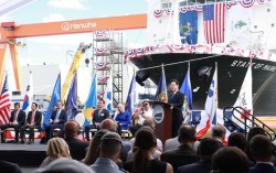 이재명 대통령이 지난 8월 26일(현지시간) 미국 필라델피아에 위치한 ‘한화 필리조선소’에서 열린 미국 해양청이 발주한 국가안보다목적선 ‘스테이트 오브 메인(State of Maine)’호의 명명식에서 축사를 하고 있다. 대통령실사진기자단 한화오션은 HM…