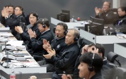 27일 전남 고흥군 나로우주센터 발사지휘센터에서 관계자들이 누리호가 성공적으로 발사되자 박수치고 있다. 누리호는 이날 탑재 위성들을 계획된 궤도에 안착시켰다. [사진 한국항공우주연구원] 한국형 발사체 누리호가 27일 4차 발사에 성공했다. 정부 주도로 성…