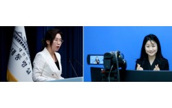 12일 서울 용산 대통령실 청사에서 수어통역사(오른쪽)가 강유정 대통령실 대변인의 현안 브리핑(왼쪽)에 대한 수어 통역을 하고 있다. 대통령실은 청각·언어장애인들의 정보 접근권을 보장하고 사회통합과 국정운영의 투명성을 강화하기 위한 조치로 11일부터 브리핑 수어 …