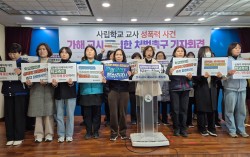 울산여성연대를 비롯한 지역시민사회단체·정당 39곳은 12일 울산시교육청 프레스센터에서 기자회견을 열고 울산 사립고교 내 성폭력 사건을 규탄하고 있다. 뉴시스 울산의 한 사립고등학교에서 재단 이사장과 친인척 관계인 교사가 기간제 여교사들을 상대로 성폭행과 …